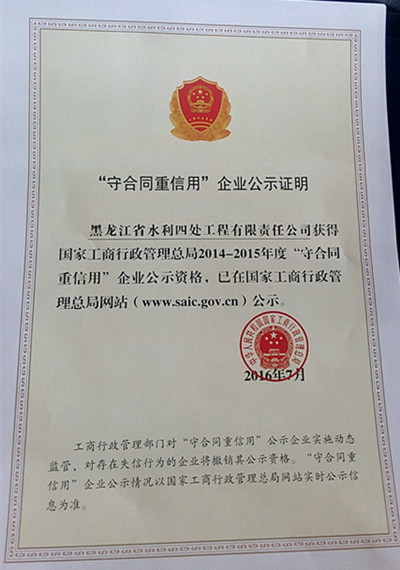 2014-2015年度國家級“守合同重信用企業(yè)”證書