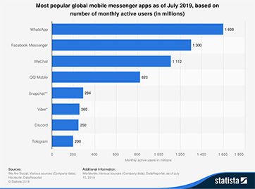WhatsApp作為Facebook旗下的即時通訊服務平臺,在全球范圍內(nèi)活躍用戶數(shù)量已超過20億,成為活躍用戶數(shù)量僅次于Facebook的線上溝通渠道,據(jù)2019年數(shù)據(jù)顯示,每天通過WhatsApp發(fā)送的消息超過650億條。