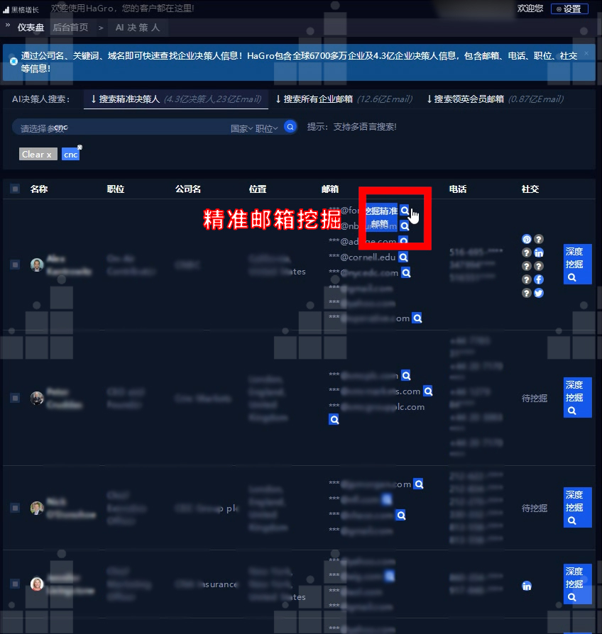 精準(zhǔn)郵箱挖掘→對決策人進(jìn)行搜索時,精準(zhǔn)挖掘某個指定郵箱: