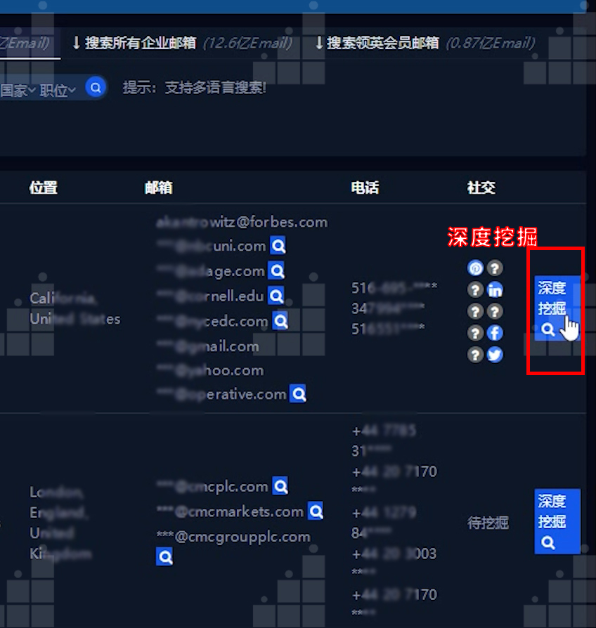 深度挖掘→對該目標(biāo)決策人進(jìn)行深度挖掘獲取郵箱、電話、社交等更為全面的信息: