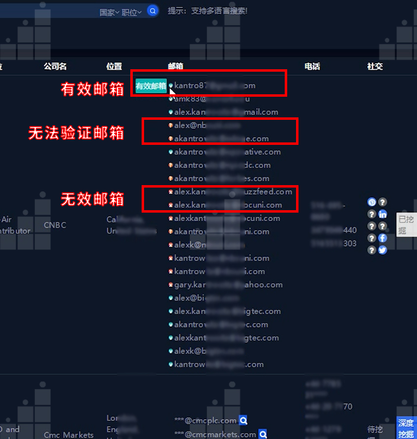 郵箱有效驗證→在進(jìn)行深度挖掘之后,便可對決策人郵箱進(jìn)行有效驗證,快速分辨決策人的有效郵箱、無效郵箱以及無法驗證郵箱,快速采集客戶的有效信息: