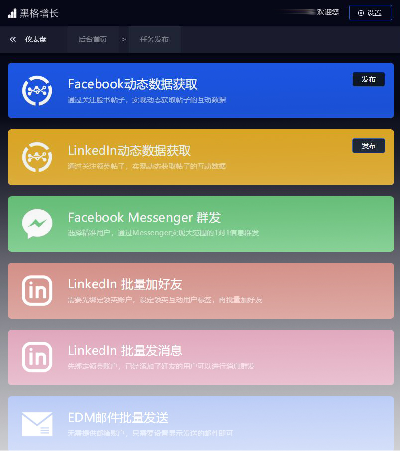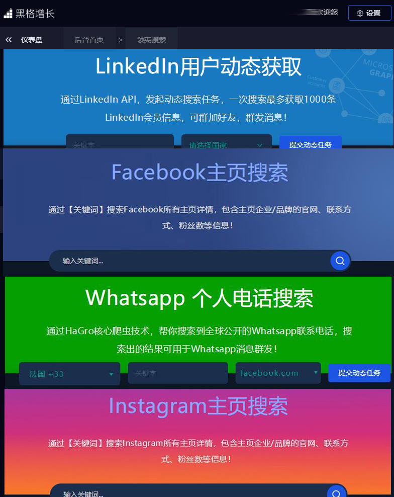 HaGro【黑格增長】通過對社交媒體大數(shù)據(jù)的挖掘,為外貿(mào)企業(yè)搭建了多個高效的社媒獲客端口,只需通過簡單的關(guān)鍵詞搜索,便可快速定位行業(yè)潛客,并實現(xiàn)社交媒體批量添加好友、群發(fā)消息等功能,讓外貿(mào)企業(yè)能夠更為便捷地實現(xiàn)社交平臺自動化營銷,獲取社交平臺紅利,拓展出海貿(mào)易業(yè)務(wù)。