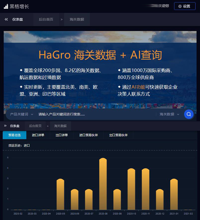 HaGro【黑格增長】,在大數(shù)據(jù)+AI技術(shù)的支撐下為外貿(mào)出口企業(yè)在獲客上實現(xiàn)爆發(fā)增長,讓企業(yè)實現(xiàn)低成本爆發(fā)式精準(zhǔn)獲客,提升企業(yè)的投資回報率,為外貿(mào)企業(yè)提供一個更為全面、高效、智能的外貿(mào)獲客系統(tǒng),致力于為外貿(mào)企業(yè)提供更好的出海服務(wù)!
