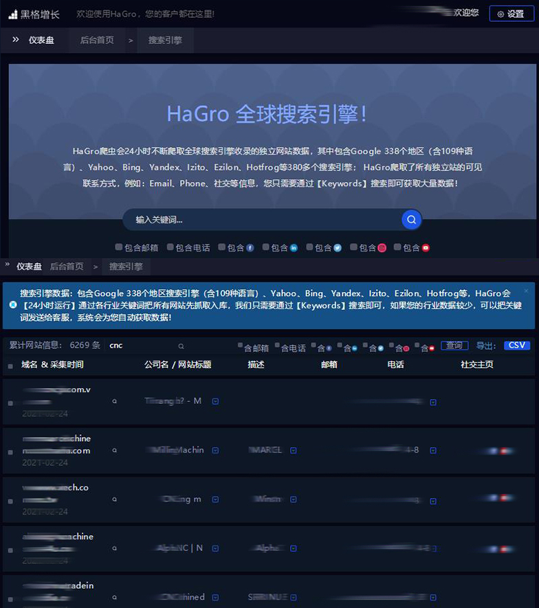 HaGro【黑格增長】過濾掉搜索引擎上繁雜的無效信息,直接鎖定與關(guān)鍵詞匹配的企業(yè)域名,快速定位行業(yè)內(nèi)精準(zhǔn)客戶,同時挖掘企業(yè)郵箱、電話、社交等有效聯(lián)系信息,大大提高外貿(mào)企業(yè)的獲客效率。