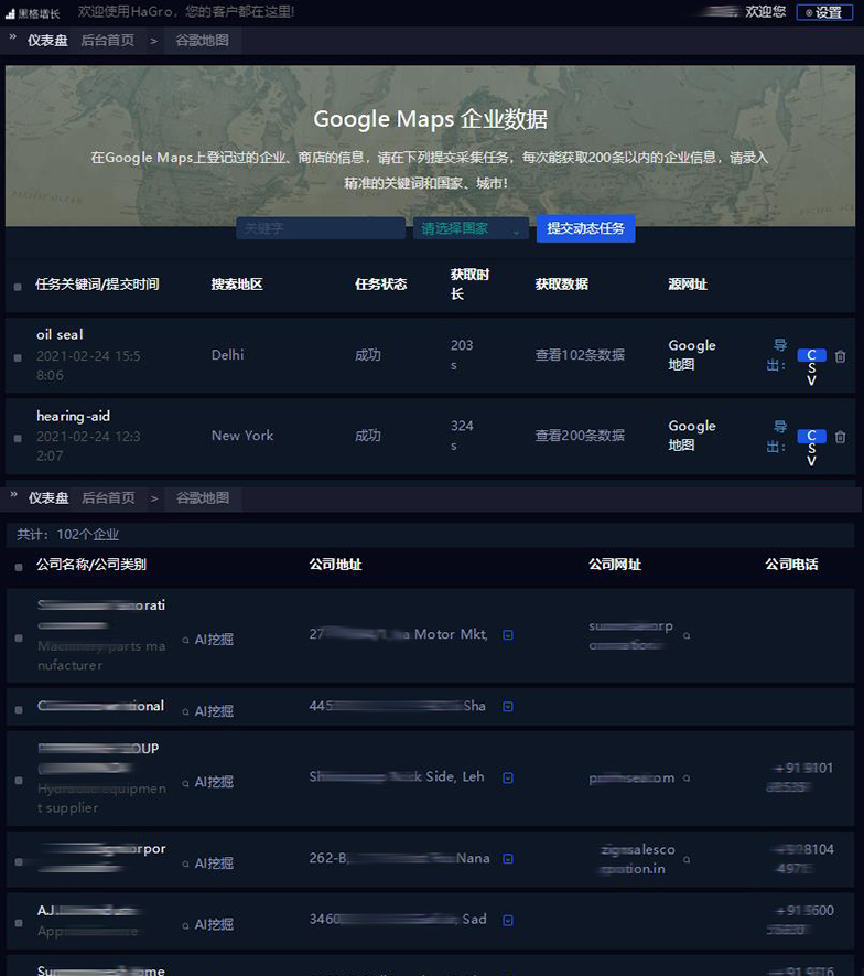 通過HaGro【黑格增長】所提供的谷歌地圖功能,外貿(mào)企業(yè)可以鎖定某一地點區(qū)域進(jìn)行精準(zhǔn)客戶搜索,快速獲取該區(qū)域內(nèi)批量精準(zhǔn)客戶,并對企業(yè)采購決策人進(jìn)行挖掘,快速獲取多種有效聯(lián)系方式,實現(xiàn)高效獲客。