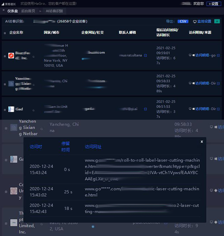 HaGro【黑格增長】通過對獨立站訪客的監(jiān)控,提升了獨立站的“引流”價值,讓外貿(mào)企業(yè)能夠通過訪客數(shù)據(jù)開發(fā)更為精準(zhǔn)的潛在客戶,同時,通過獨立站訪客訪問痕跡的比重來對獨立站頁面質(zhì)量進(jìn)行把關(guān)。