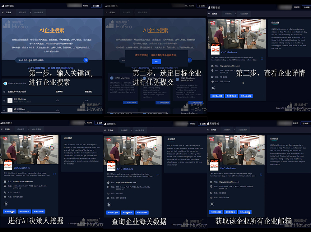 同時,HaGro【黑格增長】建立了【AI決策人挖掘】、【海關(guān)數(shù)據(jù)查詢】、【所有企業(yè)郵箱搜索】三大功能的跳轉(zhuǎn)接口,可以直接對該企業(yè)的采購決策人進行挖掘、對該企業(yè)的海關(guān)數(shù)據(jù)進行查詢,并可直接搜索該企業(yè)的所有企業(yè)郵箱。