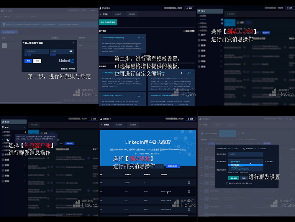 【領(lǐng)英群發(fā)】,通過對行業(yè)內(nèi)領(lǐng)英會員進行消息群發(fā)。眾所周知,通過領(lǐng)英開發(fā)客戶,只能進行一對一的消息發(fā)送,無法實現(xiàn)消息群發(fā),而HaGro【黑格增長】的【領(lǐng)英群發(fā)】功能便為外貿(mào)企業(yè)創(chuàng)建了群發(fā)消息的接口,幫助企業(yè)更好地實現(xiàn)自動化營銷。