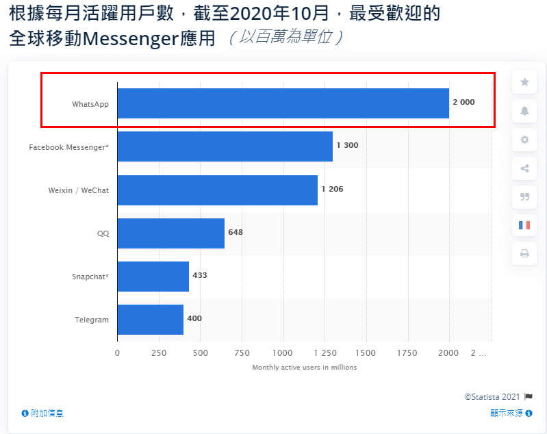 據(jù)2020年的數(shù)據(jù)統(tǒng)計(jì),WhatsApp在全球180個(gè)國家/地區(qū)里有超過20億活躍用戶,每天有10億人使用WhatsApp,650億條消息通過WhatsApp發(fā)送,正是如此,WhatsApp成為世界上最受歡迎的消息傳遞應(yīng)用軟件。