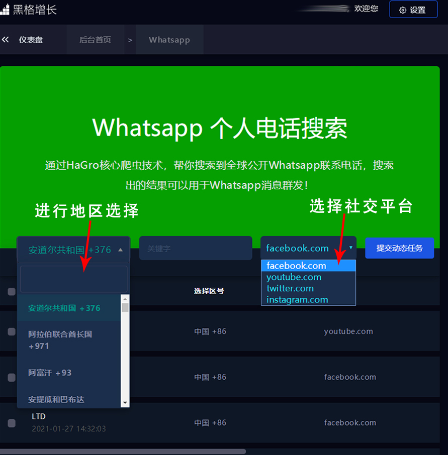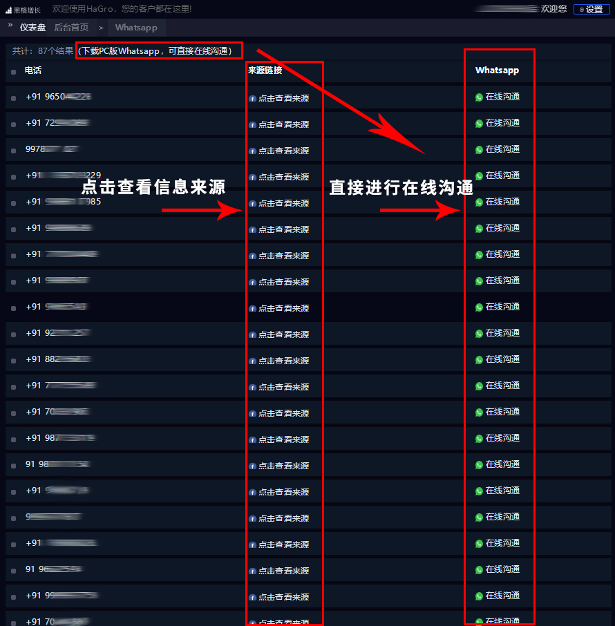 實(shí)質(zhì)上,找電話號(hào)不難,難的是能夠找到精準(zhǔn)客戶的電話號(hào)碼。不過,通過HaGro【黑格增長】的【W(wǎng)hatsApp】功能,就能快速獲取批量潛在客戶的電話號(hào)碼。