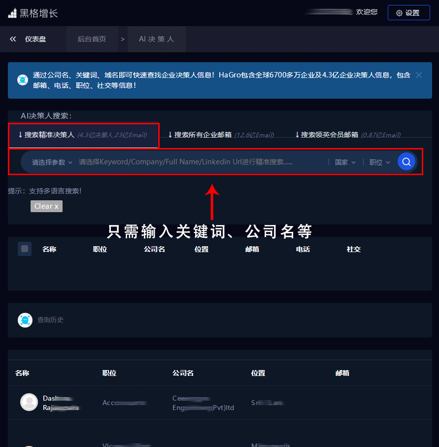 通過WhatsApp功能找到該客戶社交主頁上留下的信息,如企業(yè)名、企業(yè)網(wǎng)址、企業(yè)郵箱等,再用這些信息通過黑格增長的【AI決策人】功能挖掘該客戶所在企業(yè)的采購決策人及聯(lián)系方式、所有企業(yè)郵箱等聯(lián)系信息。