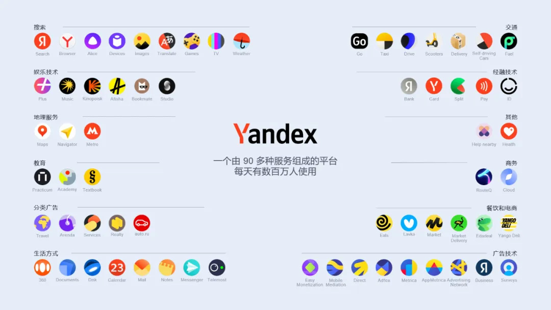Yandex作為俄語市場的門戶,每天獨立訪問者超過5040萬人,其廣告服務(wù)每天被超過1500萬人使用。同時,它也是俄羅斯本土的搜索引擎,對于當(dāng)?shù)赜脩魜碚f,它不僅是搜索引擎,還提供多種服務(wù),如打車APP、地圖服務(wù)、電商平臺、外賣服務(wù)、視頻軟件和郵箱等,形成了豐富的產(chǎn)品生態(tài)鏈。