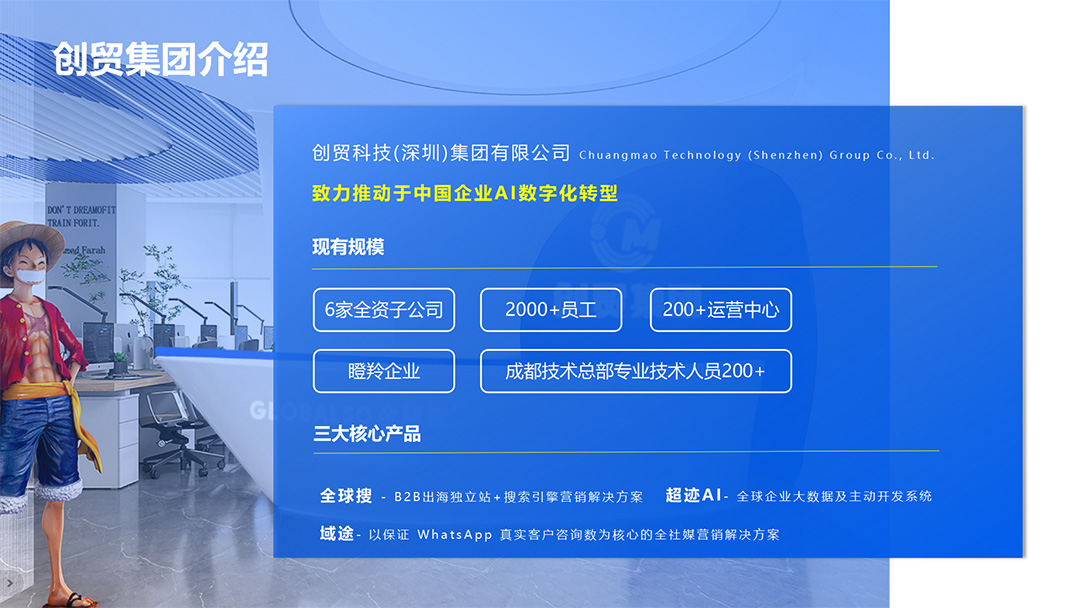 創(chuàng)貿(mào)集團以企業(yè)SaaS服務(wù)為導(dǎo)向,專注技術(shù)研發(fā)與創(chuàng)新,全力助力中國企業(yè)AI轉(zhuǎn)型升級。企業(yè)擁有50+項軟件專利,以及全球搜、超跡AI、域途等在內(nèi)的多個品牌和商標(biāo)。