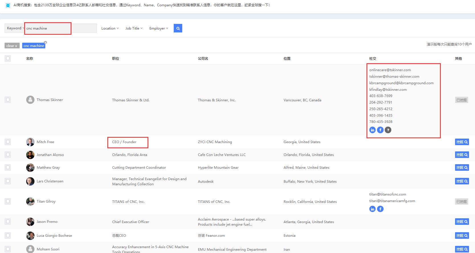 如上圖,海量的線上數(shù)據(jù),客戶只需要輸入關鍵詞點擊搜索即可獲取目標客戶及公司職員的郵箱、電話、社交等有效信息。