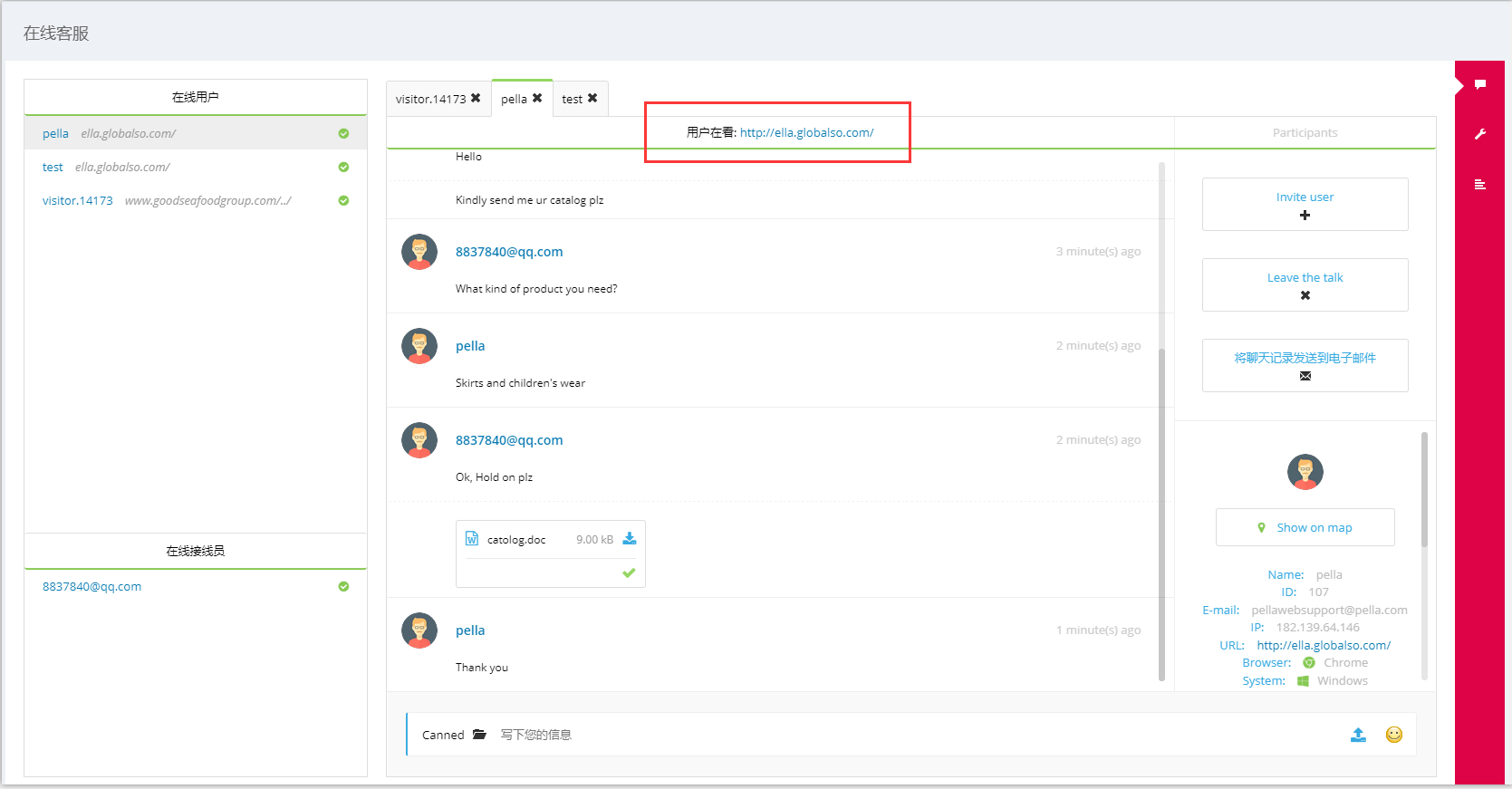 此外,數(shù)據(jù)大師還帶有在線聊天功能,能夠?qū)崟r(shí)追蹤客戶正在看的網(wǎng)站,有針對性的做產(chǎn)品服務(wù);聊天結(jié)束后,你還可以將你們的聊天記錄發(fā)送至你的郵箱,避免內(nèi)容遺忘。