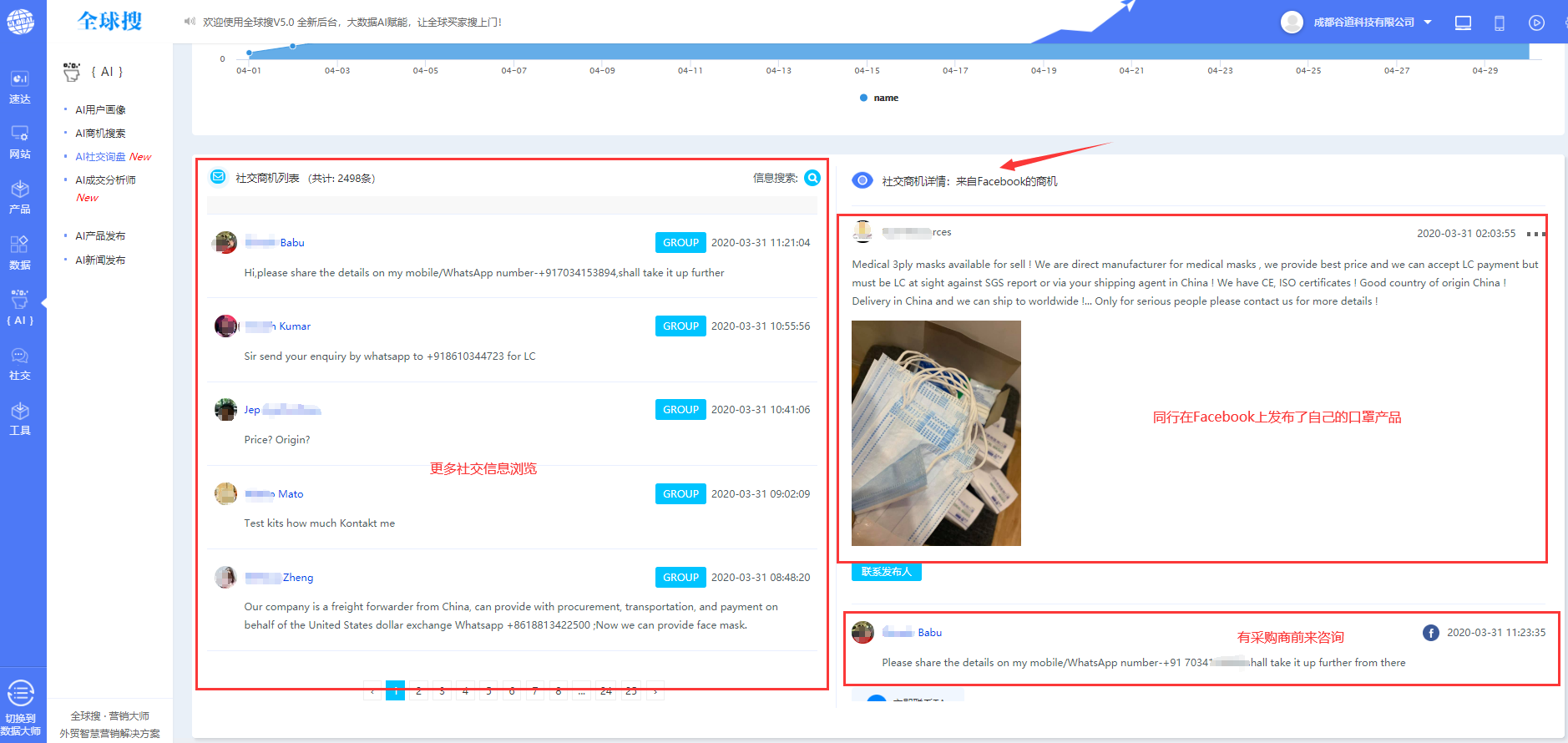 整合了各大社交平臺的信息,只要你輸入關(guān)鍵詞,就可以查詢到與該關(guān)鍵詞相關(guān)的所有社交詢盤(包括評論,帖子),讓你在第一時間,與意愿采購者取得聯(lián)系。