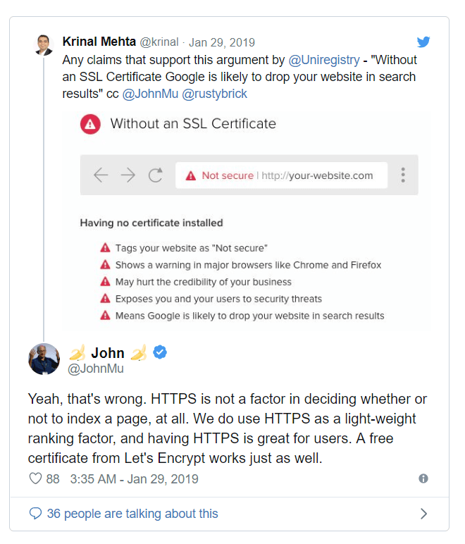 搜索引擎表示,HTTPS是影響排名因素之一。約翰·穆勒(John Mueller)證實(shí)了這一點(diǎn)。