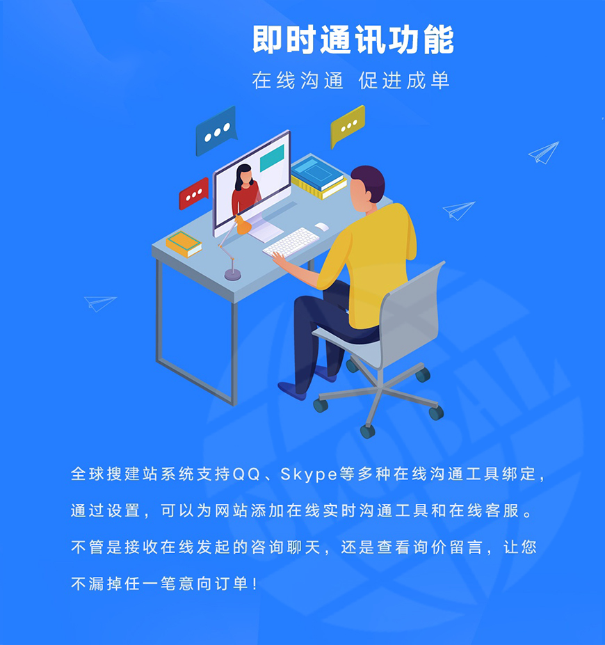 傳統(tǒng)的獨(dú)立站,需要客戶發(fā)送詢盤,然后業(yè)務(wù)員再通過郵件的方式與客戶取得聯(lián)系,這樣的一番操作下來,客戶又會(huì)去撩撥別的廠商了,而在線聊天可實(shí)時(shí)追蹤客戶正在看的網(wǎng)站,有針對(duì)性的做產(chǎn)品服務(wù);聊天結(jié)束后,你還可以將你們的聊天記錄發(fā)送至你的郵箱,避免內(nèi)容遺忘。