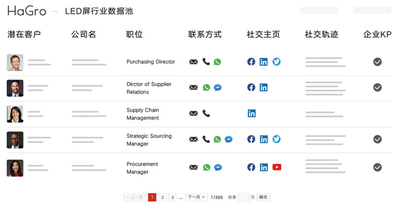 在定位行業(yè)之后,借助HaGro,抓取多種國外社交平臺上潛在客戶的基本信息,了解潛在客戶的社交軌跡,獲取其所在企業(yè)KP的聯(lián)系方式。
